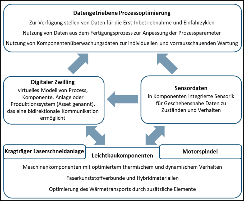 Ziel des Projektes ist es datenbasierte Prozessoptimierung durch innovative Leichtbau-Maschinenkomponenten mit integrierter Sensorik zu ermöglichen. Hiermit sollen Grundlagen für datenbasierte Anwendungen geschaffen und gleichzeitig das für Fertigungsprozesse bedeutsame thermische und dynamische Verhalten der innovativen Leichtbau-Maschinenkomponenten optimiert werden. Im Rahmen des Projekts sollen die zu entwickelnden innovativen Konzepte zur Optimierung und Sensorintegration in Bauteilen für eine CFK-Motorspindel und für den Aufbau eines Leichtbau-Kragträgers einer Laserschneidanlage umgesetzt werden. Die Messwerte aus den sensorintegrierten Leichtbau-Komponenten dienen hierbei als Eingangswerte für die Modellbildung als Basis für Digitale Zwillinge. Diese Digitalen Zwillinge bilden zusammen mit den sensorintegrierten Leichtbau-Komponenten wiederum die Grundlage für datengetriebene und effiziente Prozessoptimierung in Werkzeugmaschinen und die Anwendung digitaler Services zur Erhöhung des Durchsatzes, der Fertigungsqualität und der Energieeffizienz.